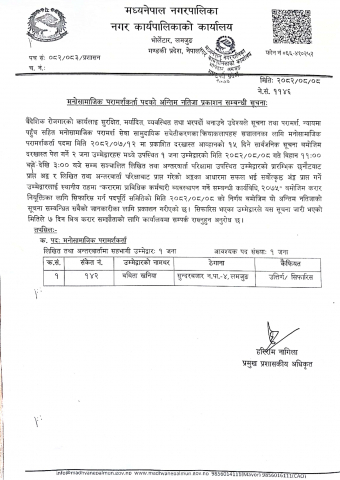 Home » मनोसामाजिक परामर्शकर्ता पदको अन्तिम नतिजा प्रकाशन सम्वन्धी सुचना