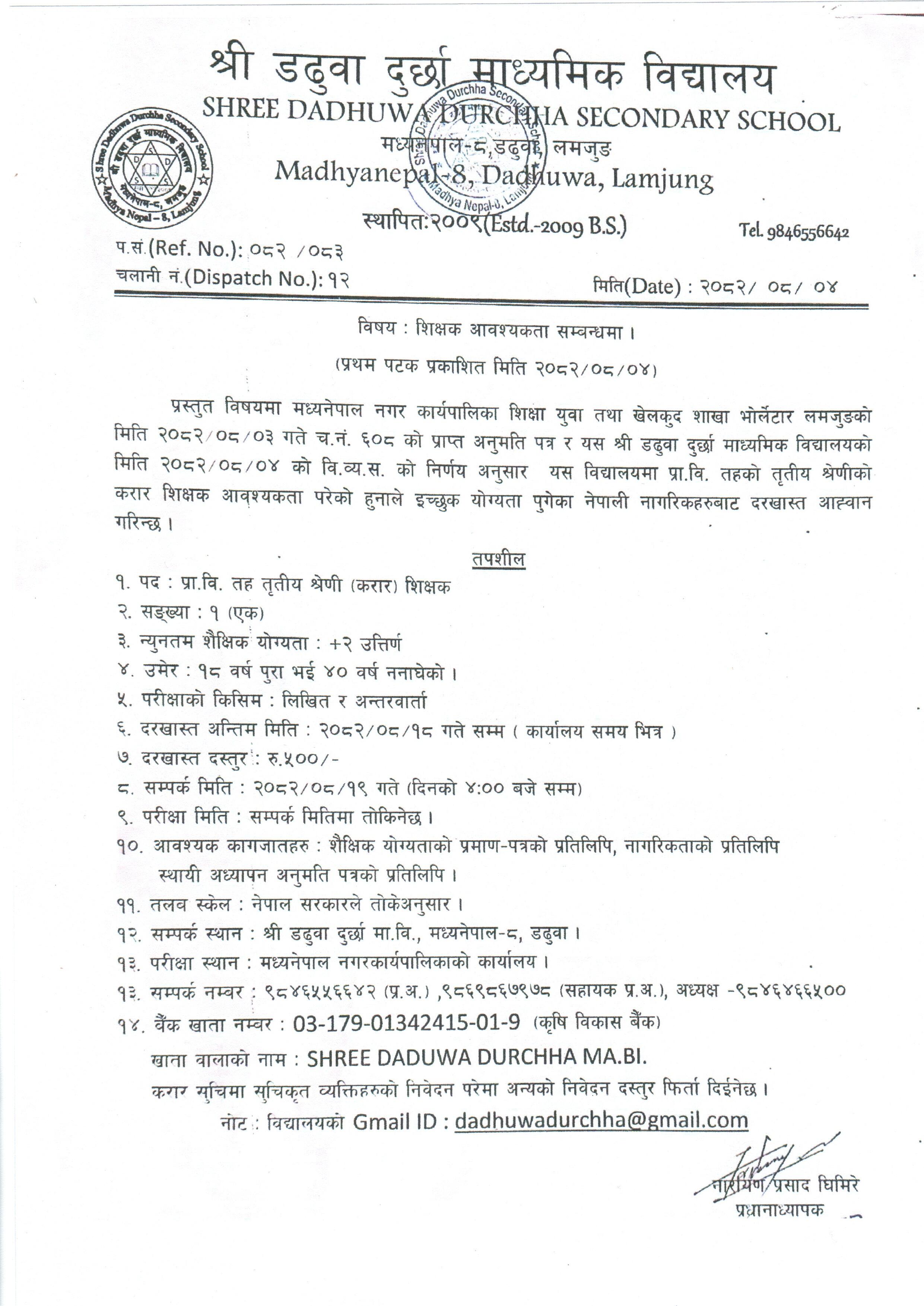 शिक्षक आवश्यकता सम्बन्धी सूचना