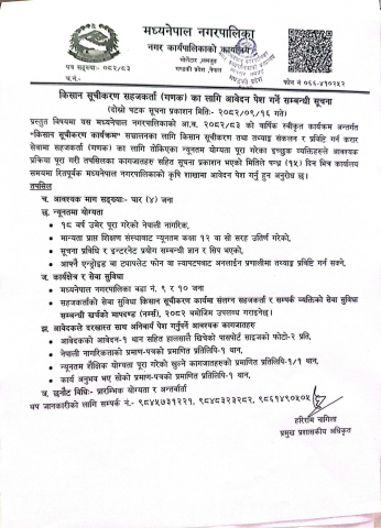 किसान सुचीकरण सहजकर्ता (गणक) का लागि आवेदन पेश गर्ने सम्बन्धी सुचना
