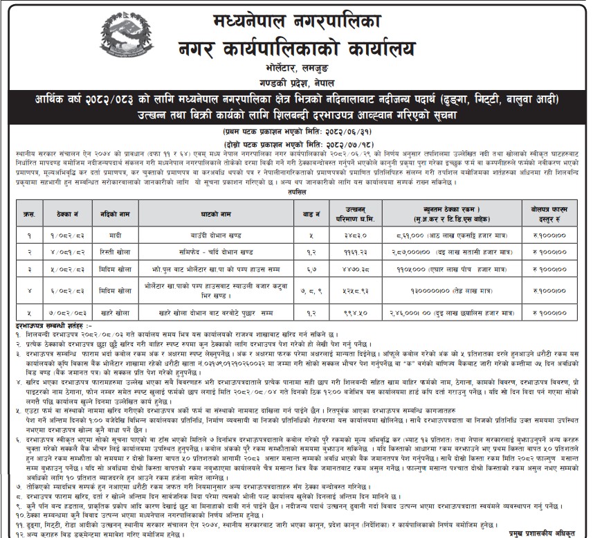आर्थिक वर्ष २०८२/८३ को लागि मध्यनेपाल नगरपालिका क्षेत्रभित्रको नदिनालाबाट नदीजन्य पदार्थ (ढुङ्गा,गिटी,बालुवा,आदि) उत्खन्न तथा बिक्रि कार्यको लागि शिलबन्दी दरभाउपत्र आह्रवान सम्बन्धी सूचना