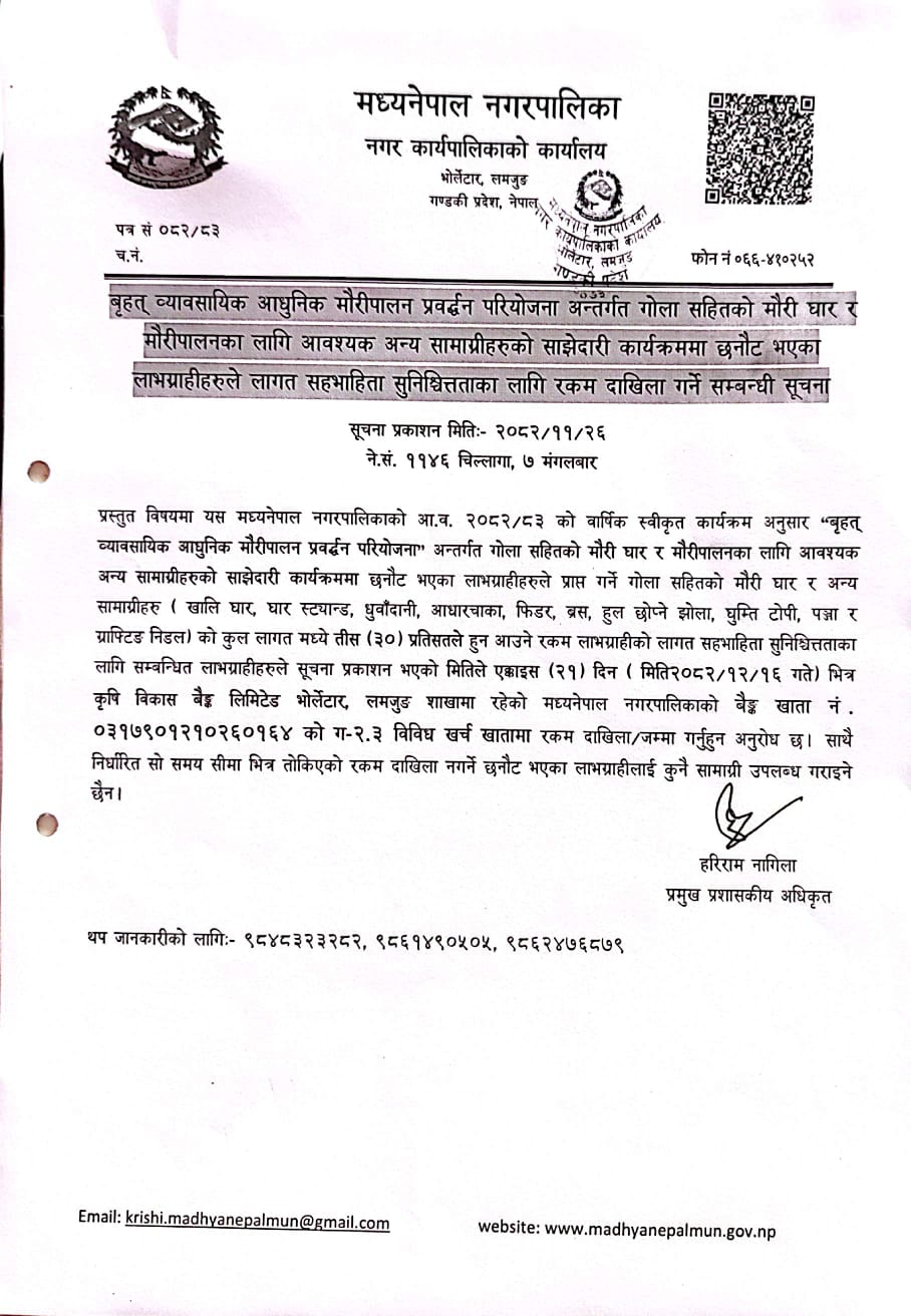 बृहत् व्यावसायिक आधुनिक मौरीपालन प्रवर्द्धन परियोजना अन्तर्गत गोला सहितको मौरी घार र मौरीपालनका लागि आवश्यक अन्य सामाग्रीहरुको साझेदारी कार्यक्रममा छनौट भएका लाभग्राहीहरुले लागत सहभाहिता सुनिश्चित्तताका लागि रकम दाखिला गर्ने सम्बन्धी सूचना